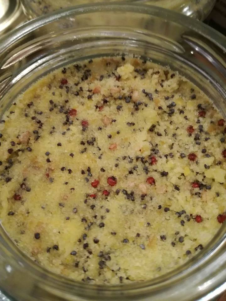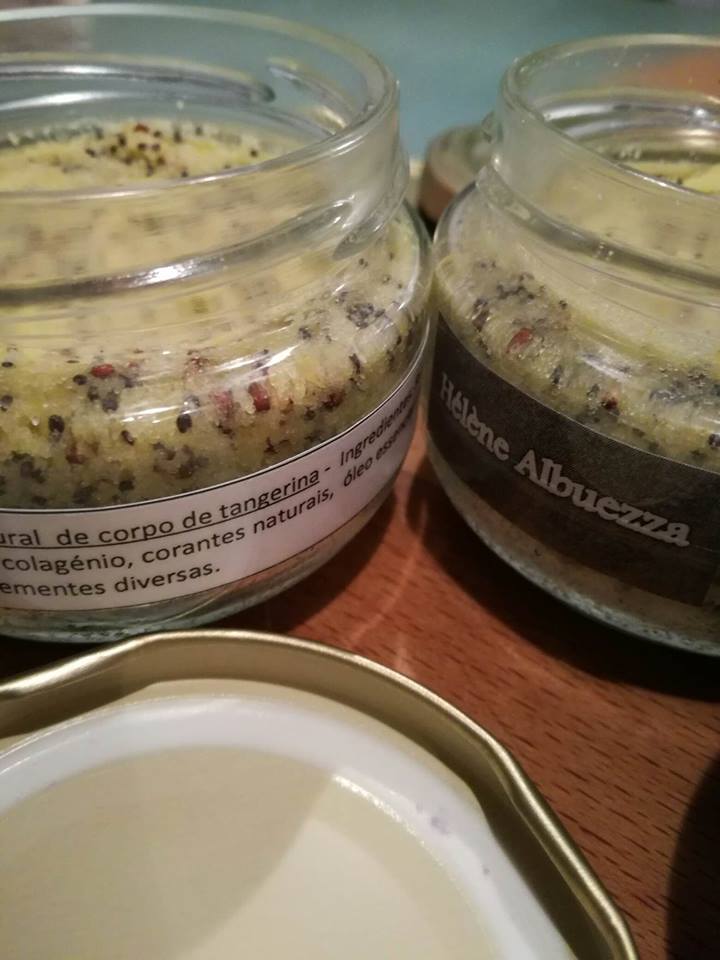 Sal, óleo de coco, colagéno, óleo essencial de tangerina/mandarina e sementes diversas