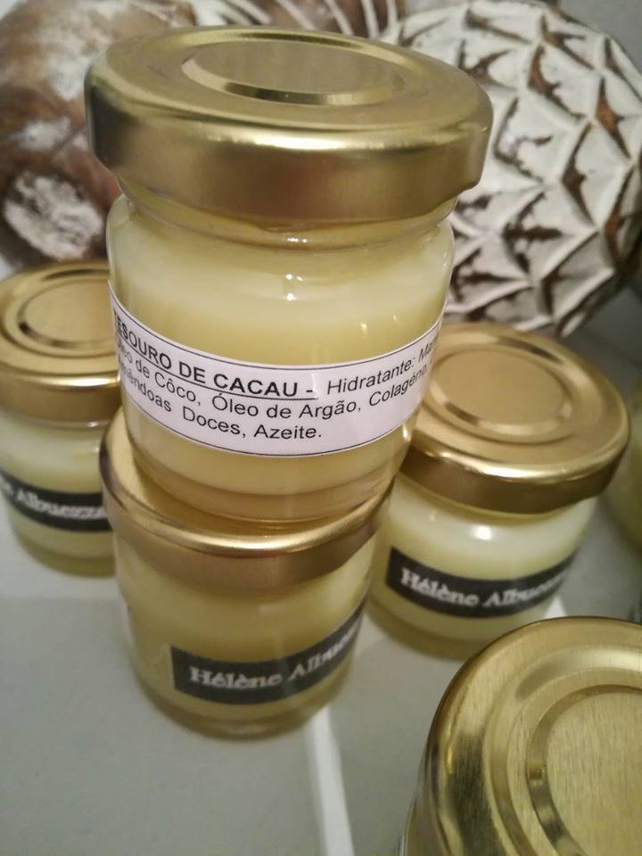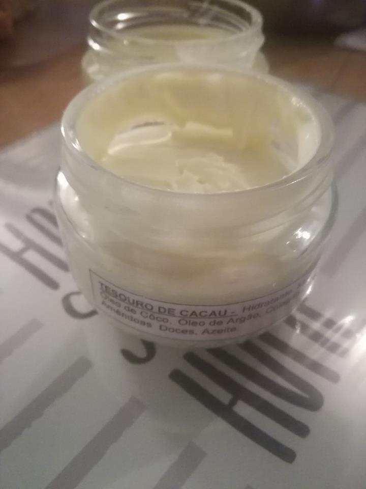 Hidratante: Manteiga de Cacau, Óleo de Côco, Óleo de Argão, Colagéno, Óleo de Amendoas Doces, Azeite.